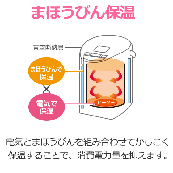 ・・・・・・・・商品特長・・・・・・・・ 用途に合わせて使い分けら れる5段階保温設定搭載! 省エネモードも搭載した 使用性が高い電気ポット ◎ポイント ・まほうびん保温 ・スピード沸とう ・大きな文字と分かりやすい操作パネル ・沸とうセーブ ・省エネモード ・ゆっくりカフェドリップ給湯 ・5段階節約タイマー ・5段階保温設定 ・ワイドウインドウ ・内容器水量目盛 ◎電気で沸かして「まほうびん保温」 電気とまほうびんを組み合わせてかしこく 保温することで、消費電力量を抑えます。