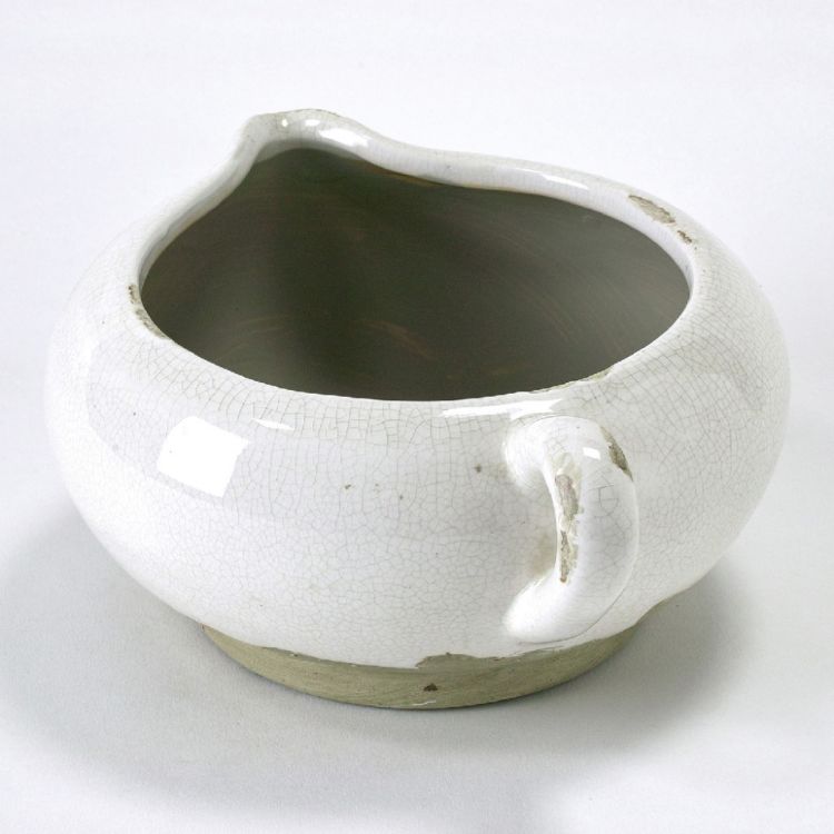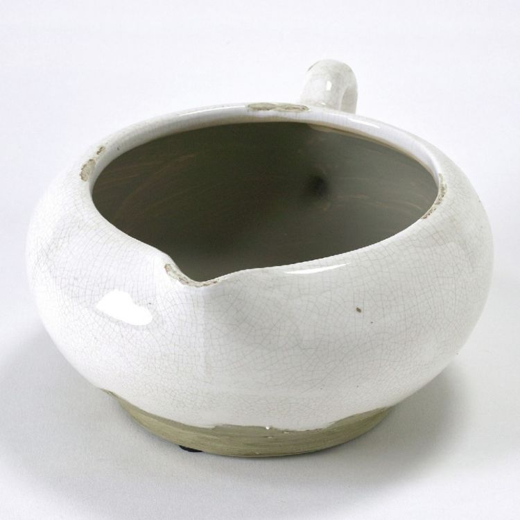 白色の表面には「貫入(かんにゅう)」と呼ばれる細かなひび模様が入り、ところどころにキズも入れてアンティーク調に仕上げたデザイン。